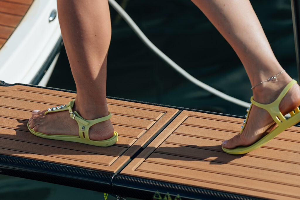 Il calpestio e le finiture sono completamente personalizzabili per adattarsi perfettamente allo stile e alle esigenze di ogni imbarcazione. Le parti metalliche sono realizzate in acciaio inox AISI 316L lucidato, per resistere agli ambienti marini.